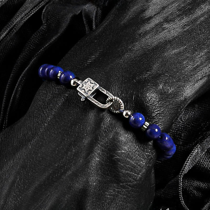 Das Armband mit kaiserblauen Lapislazuli-Perlen steht für Weisheit, Klarheit und innere Wahrheit und symbolisiert königliche Eleganz und zeitlose Stärke. Lapislazuli fördert die Konzentration und das Selbstbewusstsein, während sein tiefblauer Farbton emotionale Ausgeglichenheit und ruhige Zuversicht schenkt. Zusammen ergeben sie ein edles Design, das Einsicht, Stabilität und ein selbstbewusstes Auftreten im Alltag unterstützt.