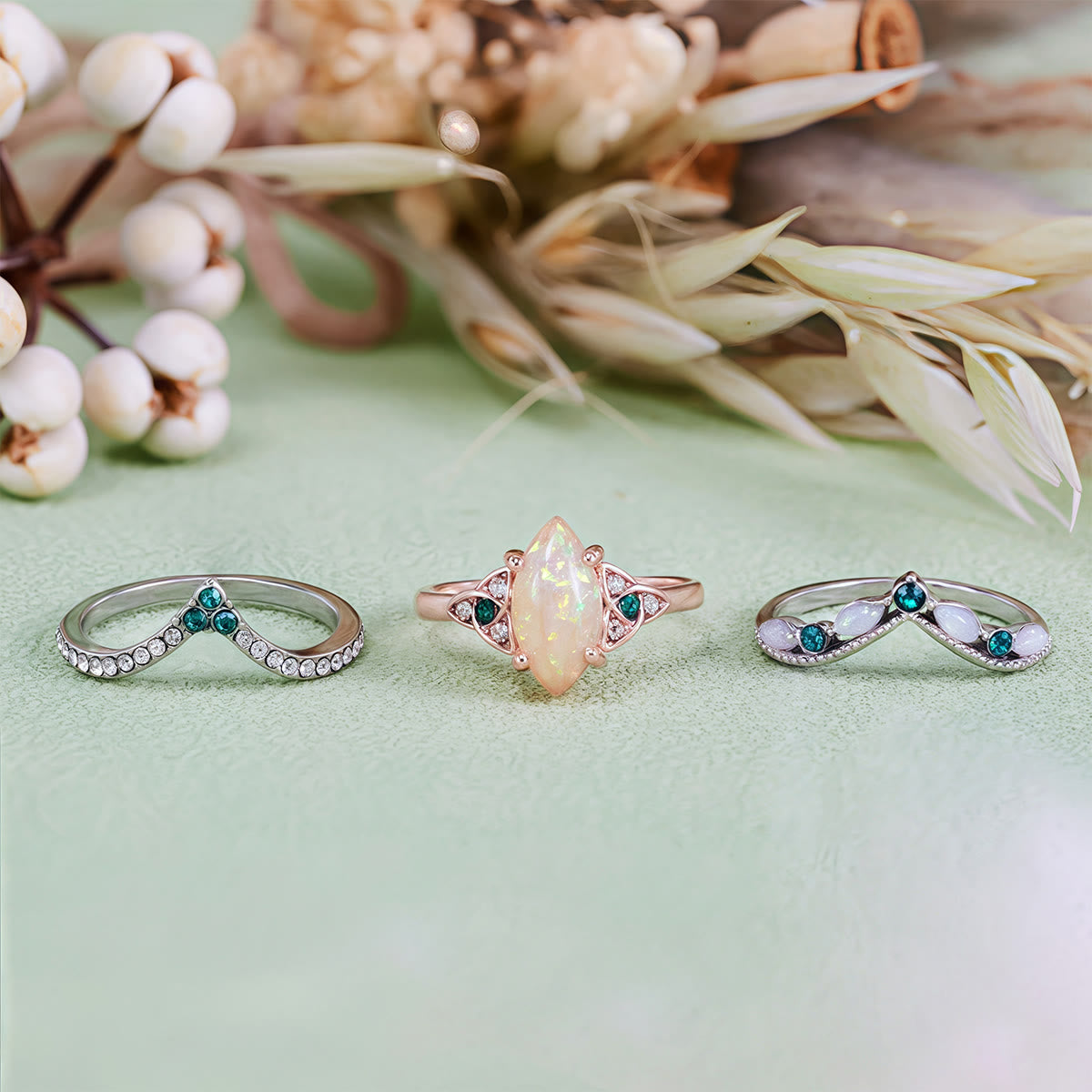 - Name: Olivenorma Vintage Milgrain Marquise Opal und Smaragd Dreiteiliges Ringset