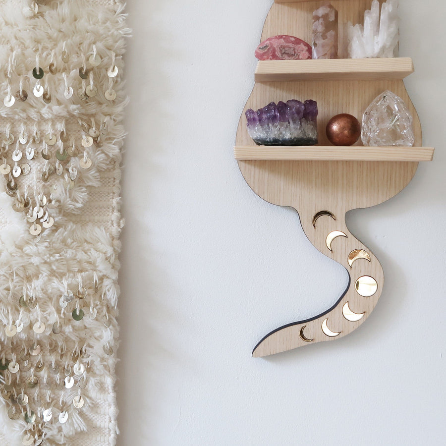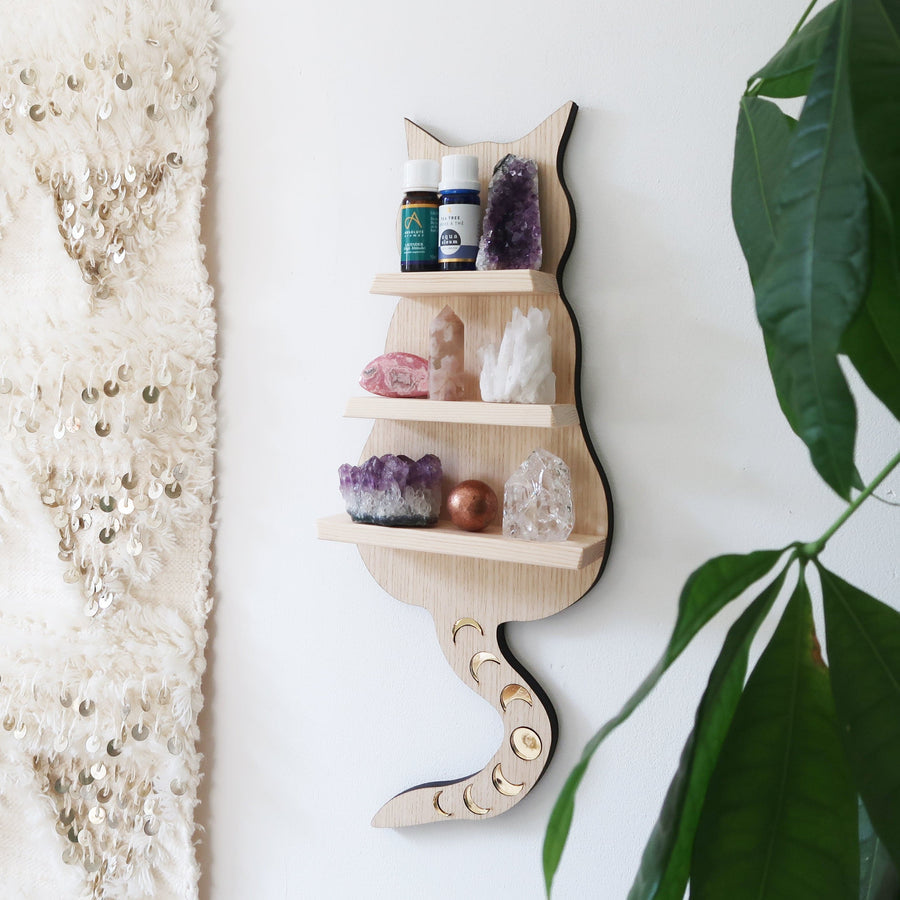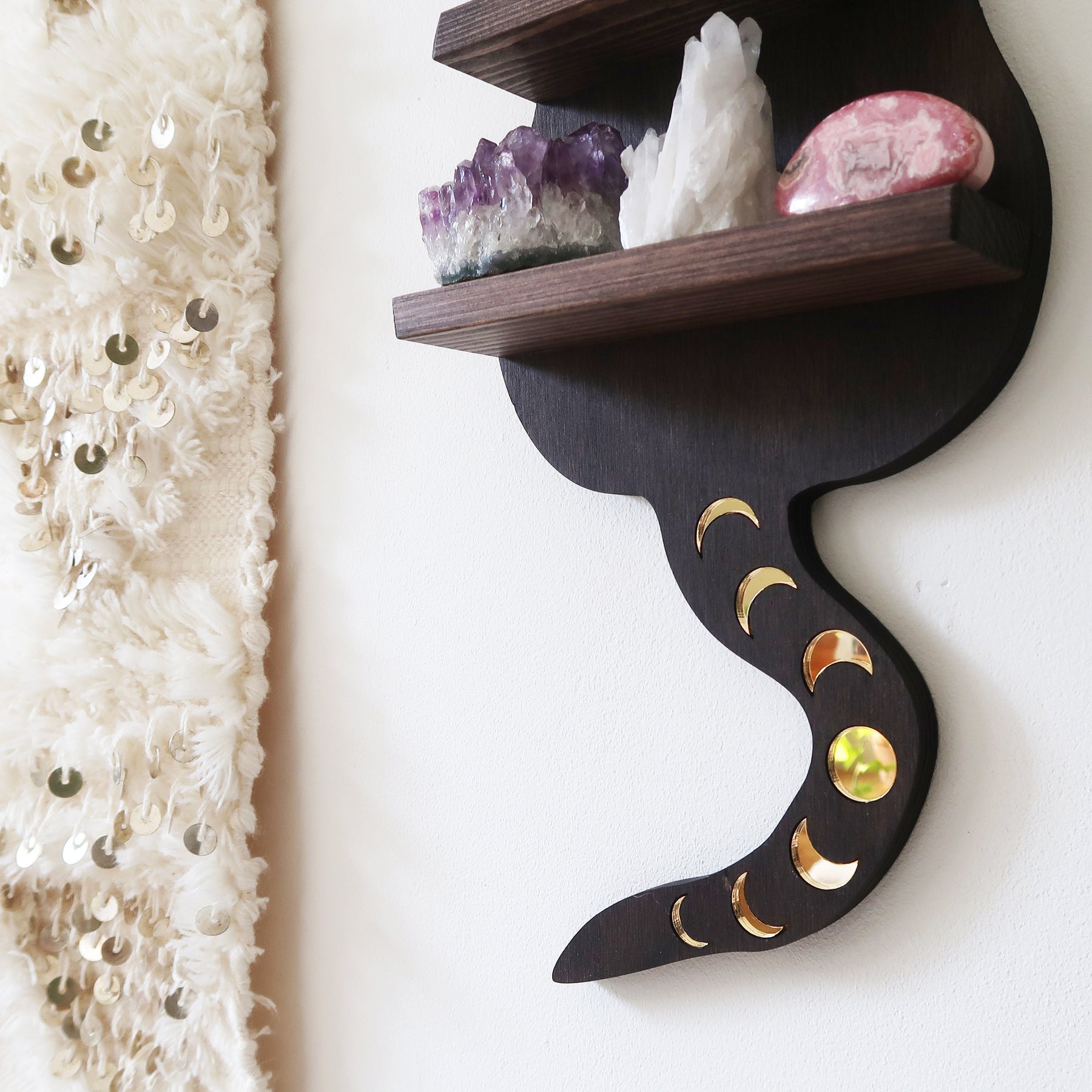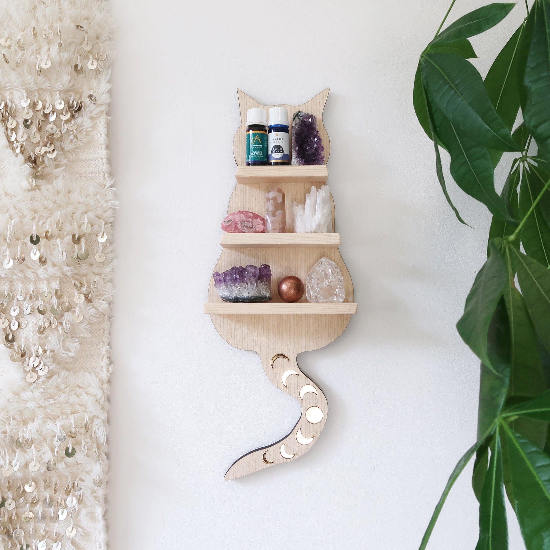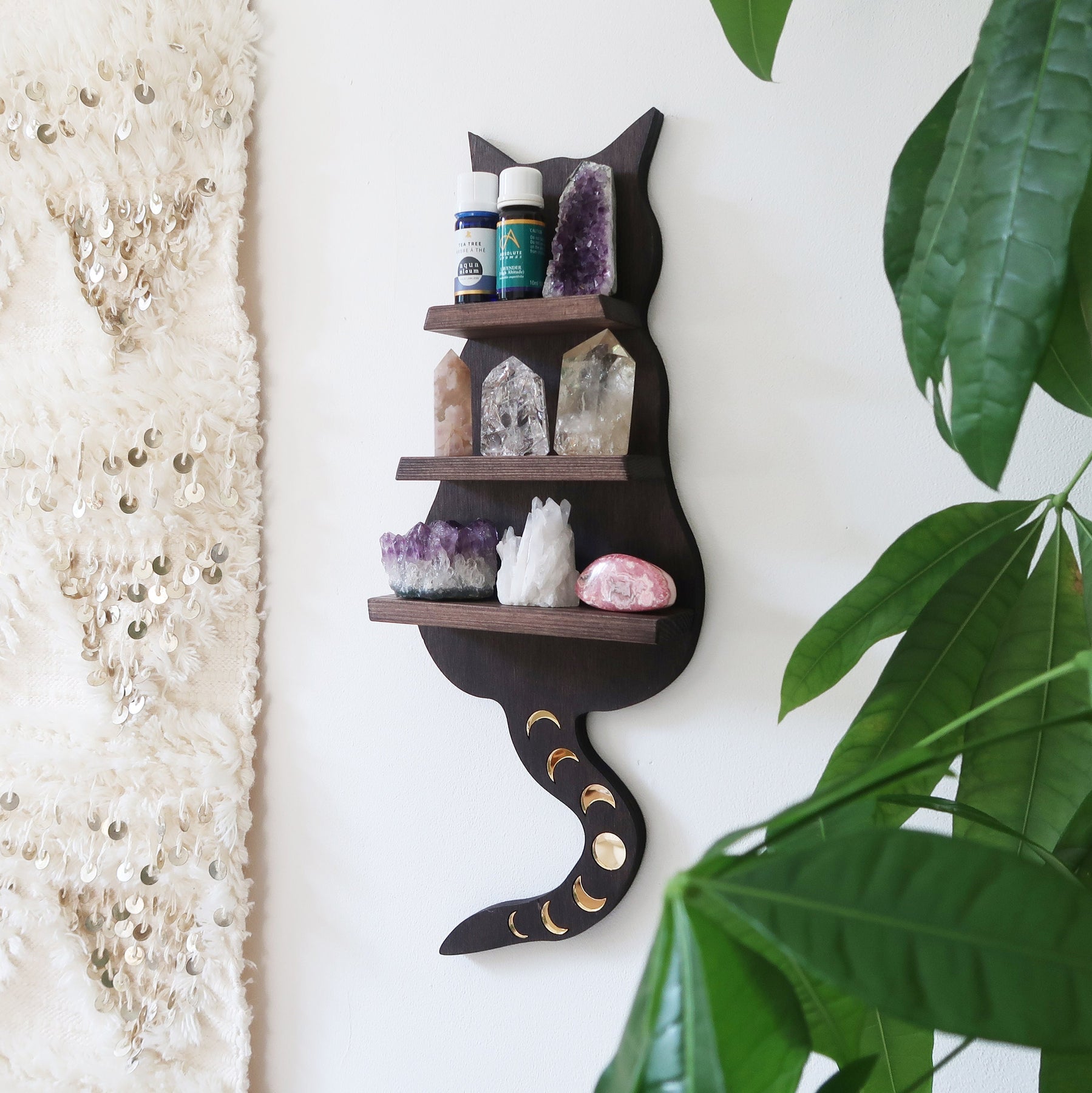 Dieses Olivenorma Dark Light Wood Cat Crystal Shelf wird ein auffälliges Dekor für Ihren Raum sein. Die Größe ist perfekt für kleine Kristalle, Kerzen, Armbänder oder andere Schätze, die Sie ausstellen möchten.