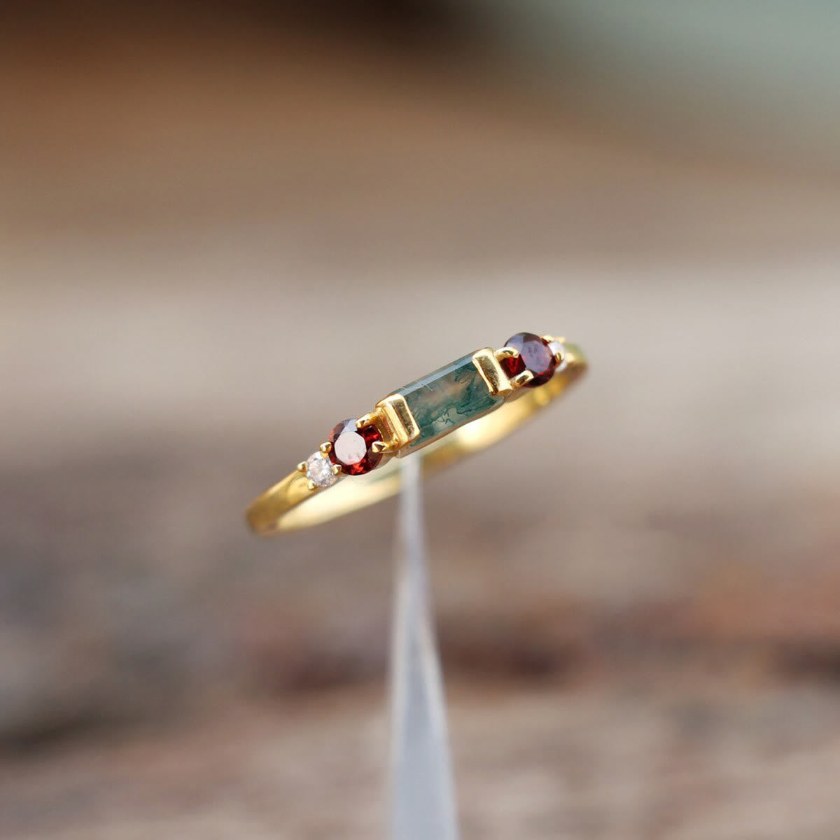 Das exquisite Schmuckstück besticht durch ein faszinierendes Herzstück aus echtem Moosachat, der für seine einzigartigen, farnartigen Einschlüsse bekannt ist, die Fülle, Wachstum und emotionale Stabilität fördern. Flankiert von zwei leuchtenden Rubinen, die Leidenschaft symbolisieren, und einem Paar strahlend weißer Zirkone für Klarheit, ist das Design ein Meisterwerk harmonischer Symmetrie.